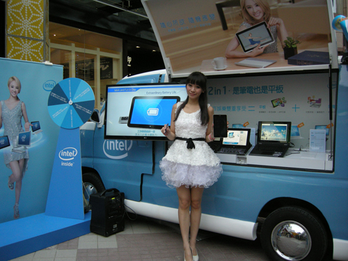 內含第 4 代 Intel Core (酷睿 )處理器系列與內含 Intel Atom Z3000 處理器系列(代號為 Bay Trail-T )的二合一( 2 in 1 )裝置、 Ultrabook 等行動裝置已陸續推出市面,為消費者的行動生活提供更多元的選擇。為了讓消費者有機會感受內含英特爾新一代產品的優異效能、二合一裝置既是平板又是筆電的獨特使用模式,以及 Ultrabook 輕薄、省電的產品特性,英特爾從 2013 年 12 月 7 日至 2013 年 12 月 28 日陸續在全省各大商圈提供 Intel 「 Look Inside 」無限可能體驗車的開放式體驗,與消費者近距離互動,並透過互動遊戲加深消費者瞭解 Intel 處理器為行動裝置提供的優異效能,若於現場購買搭載第 4 代 Intel Core 處理器的筆電或搭載 Intel 處理器的二合一裝置,還可獲得 16 GB USB3.0 隨身碟。