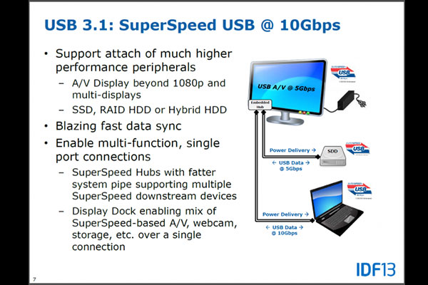 USB 3.1 相較於USB 3.0 有顯著的改善,除了在搭配英特爾第一代 Thunderbolt 技術下,速度提升兩倍之外,在電力方面,輸出提升至100 W。此外,USB 3.1 並採用名為 Type-C 的雙向連接埠,這個概念與蘋果現行的 Lightning 連接埠相同,這代表 USB 3.1 能夠更方便的連接儲存設備及外圍設備。
