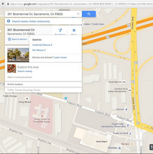 只要點選 Send to device 按鈕,就可讓用戶在電腦搜尋地圖資訊後,即時傳送至 Android 手機或平板,非常方便。(圖片來源/Express.co.uk)