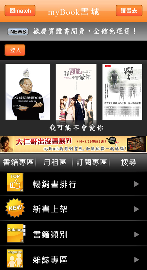 台灣大哥大 myBook 書城目前藏書量約 30 萬冊、已超過 2 百萬次下載次數,不論實體書或電子書,都有 20 種以上書籍類別,並領先業界首創有聲書系列,包含英日語學習、親子、企管等等,相較於其他電子書城, myBook 書城還有「月租包」機制,每月 49 元、 69 元、 99 元,就可看數位時代、時報週刊、 Taipei Walker 、 PChome 等 2 ~ 4 刊雜誌,每月固定時間會自動派送到線上書櫃,方便用戶隨時隨地下載閱讀,享受更便利的行動生活。