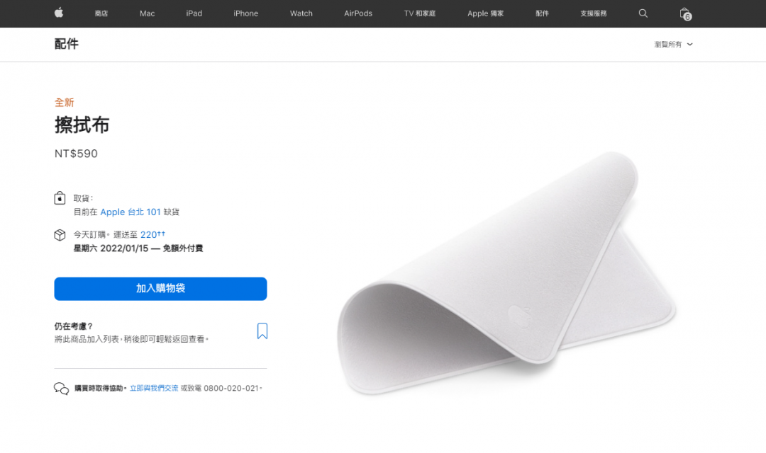 現在則是終於不必再苦等了,蘋果官網在近日已重新上架這款一條要價590元的擦拭布,顯示供貨狀況不再吃緊。以今天於蘋果官網下單為例,只需等候一個工作天,最快在明天就能到貨。