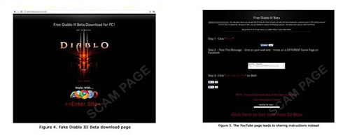 進入網站後,網友將被要求按照網頁指示下載暗黑破壞神三。然而在下載的過程中,該網頁會強迫網友分享連結於 Facebook 個人頁面, 即便網友完成所有程序,仍無法成功下載免費版暗黑破壞神三,反而被導向另一個不知名的問卷網頁。