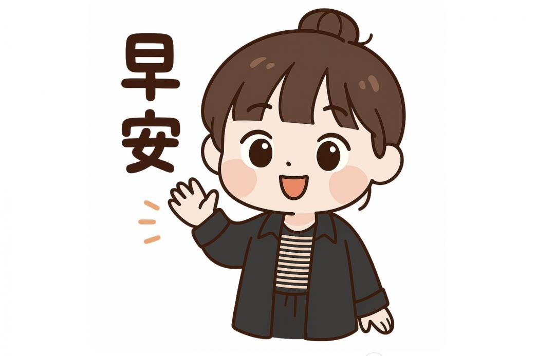 ● 指令範例一:我想一次做9張Q版貼圖,以這張照片為原型,可愛風格。每張貼圖要搭配不同的表情、動作和文字,文字包含「早安、晚安、thank you、sorry、你好、加油、Byebye、OK、Good」,且每一個字詞對應的貼圖要符合情境。