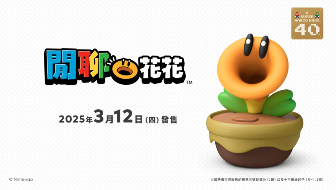 另一款登場的新品同樣來自於《超級瑪利歐》世界,是在《超級瑪利歐兄弟 驚奇》作品裡會與玩家對話的「閒聊花花」,任天堂將其實體化,完整還原了角色造型,且不只是擺設,更內建了包含中文在內的 10 種語音包,且裝置每小時會自動與玩家對話 2 次,甚至還包含了溫度感測器,會依據環境聊聊天氣,或是進行報時以及隨意的閒聊,玩家還可以設定就寢、起床時間,讓閒聊花花跟你說上早安、晚安。