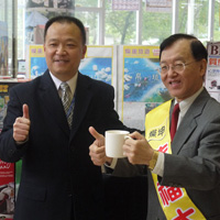 LG 55 型 LED 智慧連網電視 4 萬有找,回函再送 1000 元 7-11 禮券。左為LG 董事長金炳亨,右為燦坤副總張岳龍。